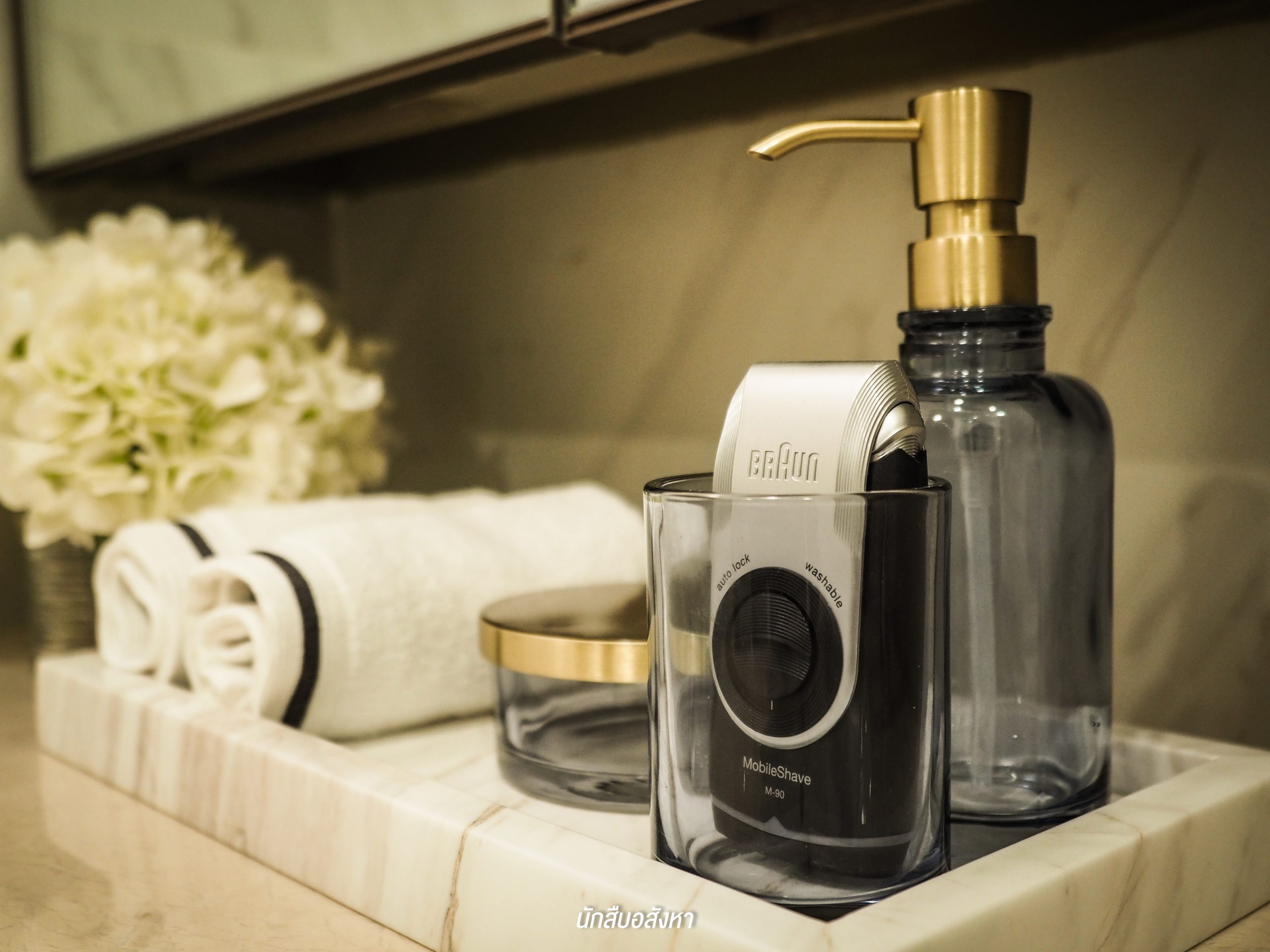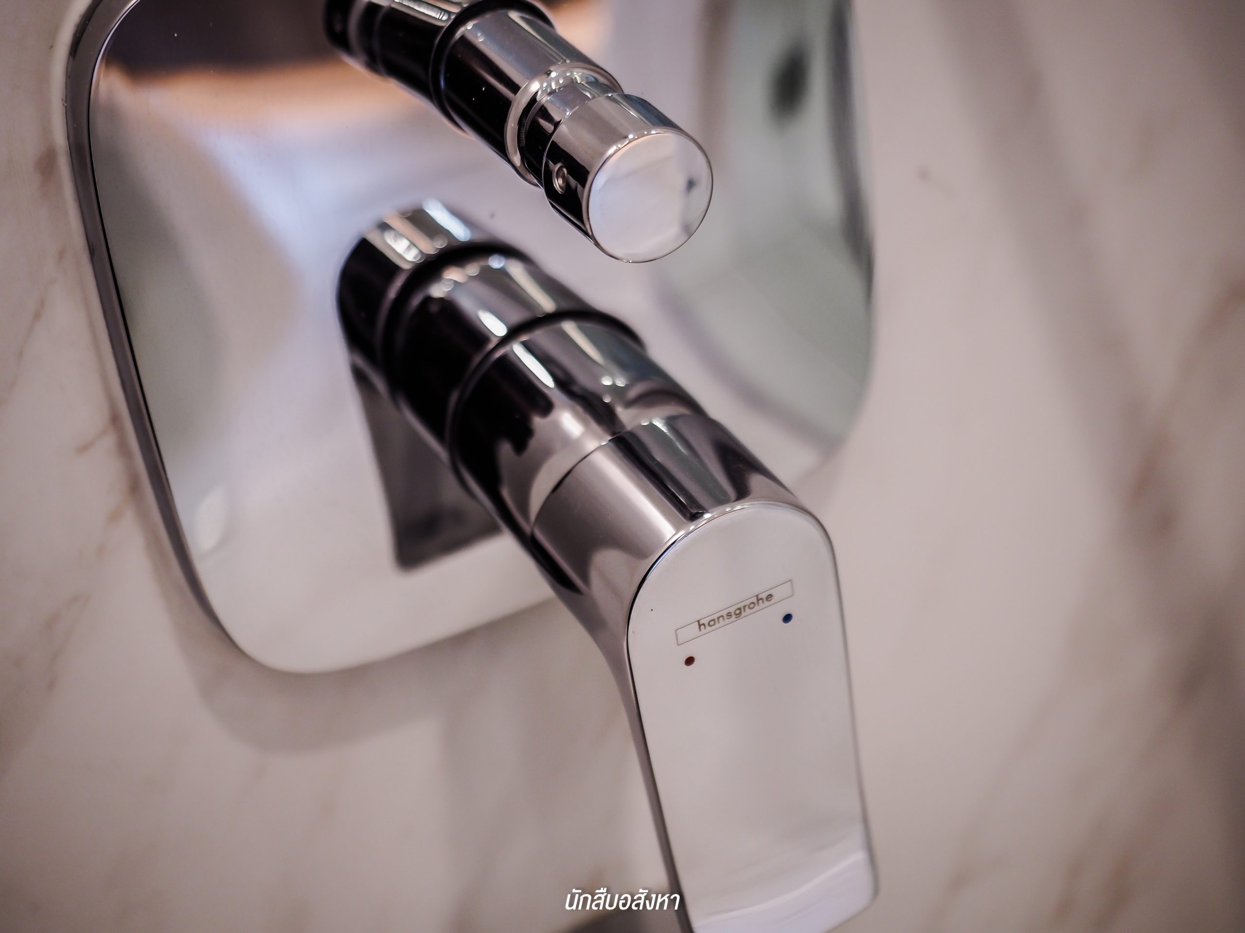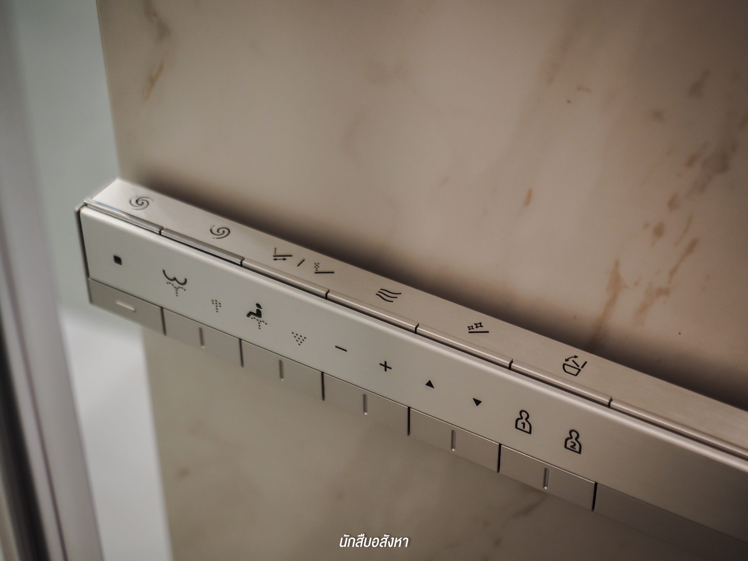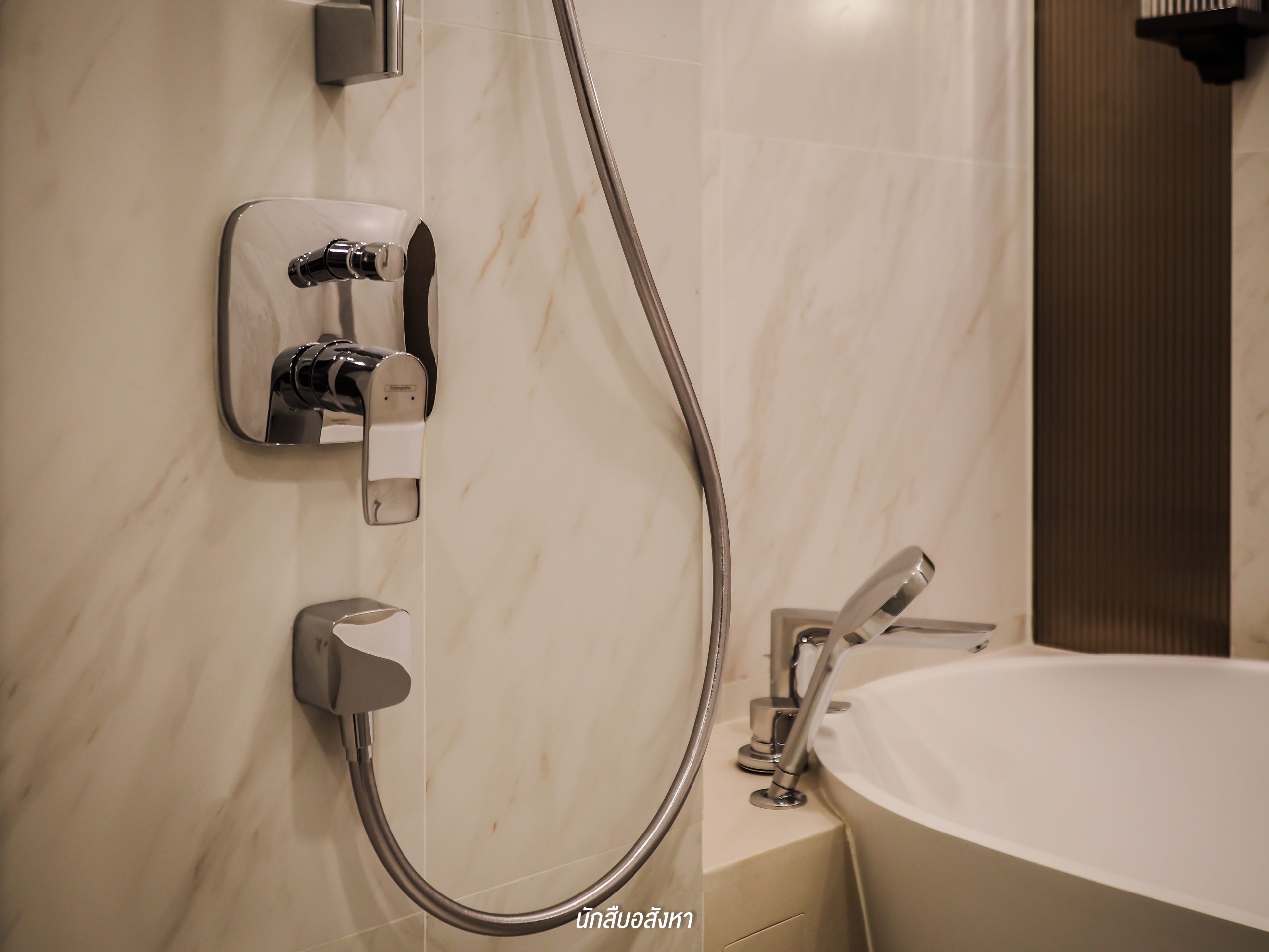 โดยตัวของ Walk-in Closet นั้นจะเชื่อมต่อกับห้องน้ำ ค่อนข้างสะดวกในการใช้งานในชีวิตประจำวัน ซึ่งห้องน้ำจะได้แบบนี้เลยครับ มีอ่างล้างหน้าให้ 2 ชุด ตัวก๊อกน้ำจะเป็นแบบร้อน/เย็น พื้นที่ภายในจะแยกโซนเป็นสัดส่วนทั้งแห้งและเปียก โซนอาบน้ำนั้นมี Rain Shower พร้อมที่นั่งสำหรับผู้สูงอายุด้วยครับ ส่วนตัวสุขภัณฑ์ของอีกโซนนั้นก็เป็นแบรนด์มาตรฐานระบบ Auto แต่สำหรับชั้นวางของด้านหลังสุขภัณฑ์นั้นทางโครงการไม่ได้ให้มาพร้อม แต่ลูกบ้านเองก็สามารถตกแต่งตามไอเดียของห้องตัวอย่างได้ครับ