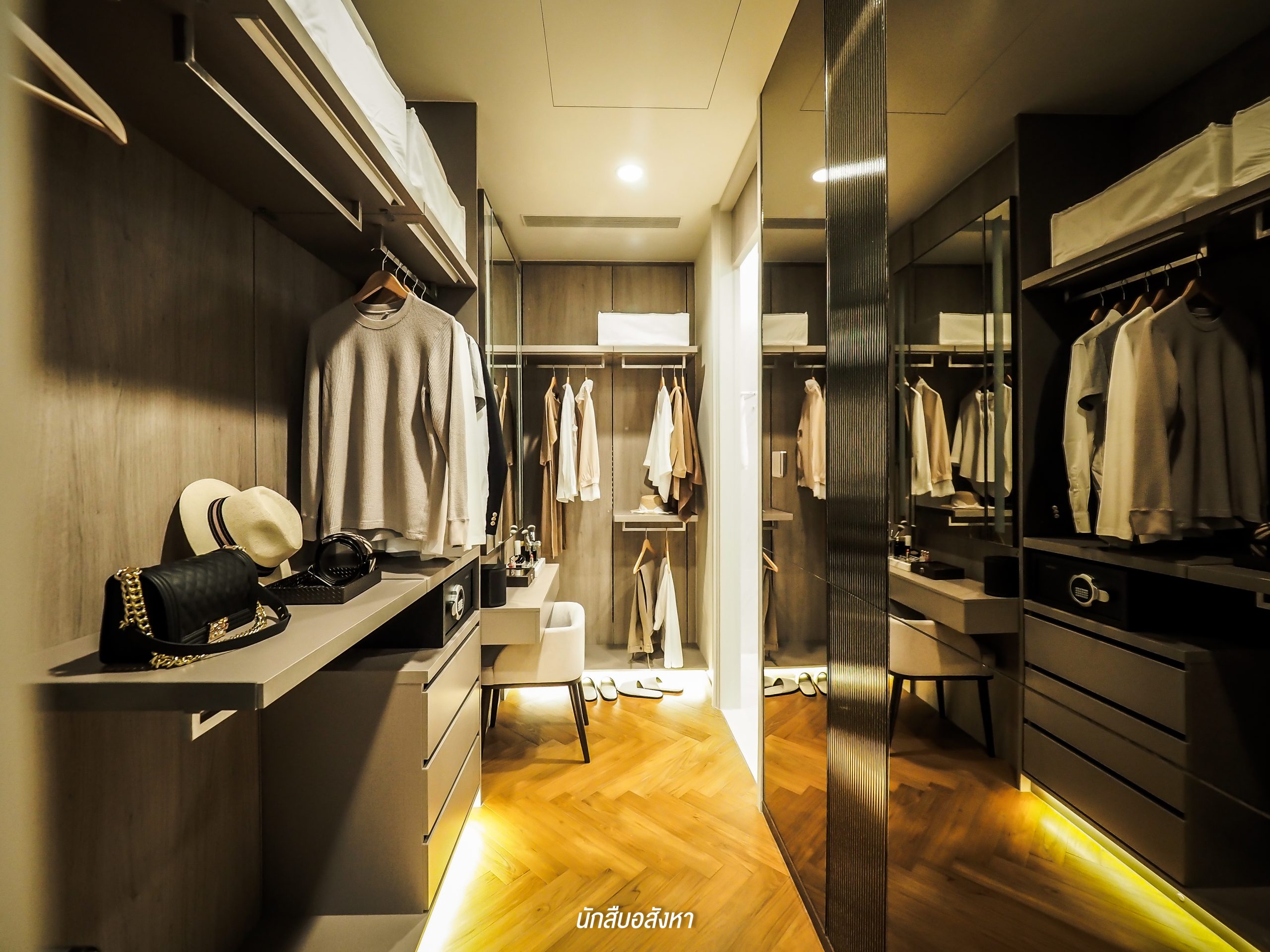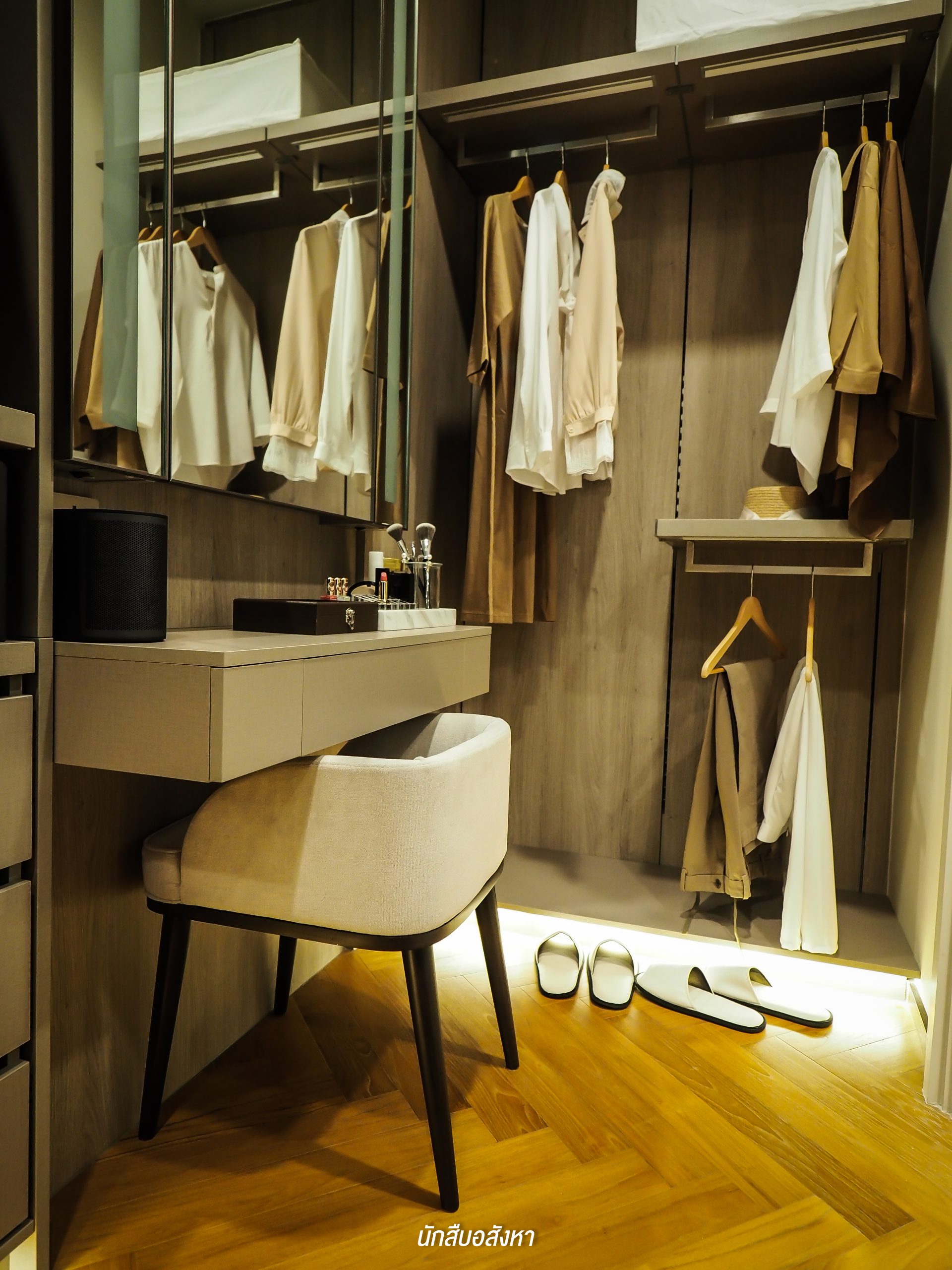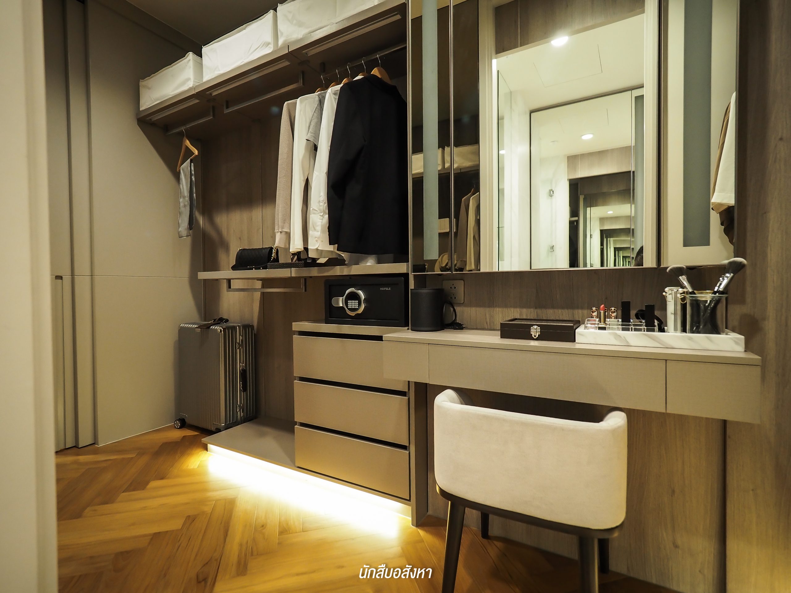 ห้องนี้มี Walk-in Closet ขนาดใหญ่ด้วยครับ ซึ่งตู้ที่เห็นในรูปก็คือทางโครงการ Built-in ให้แบบนี้เลย แต่ส่วนของกระจกหน้าโต๊ะเครื่องแป้งนั้นไม่ได้ให้มาด้วย และยังมีระบบเซ็นเซอร์สำหรับเปิดไฟตอนกลางคืนให้มาด้วยครับ