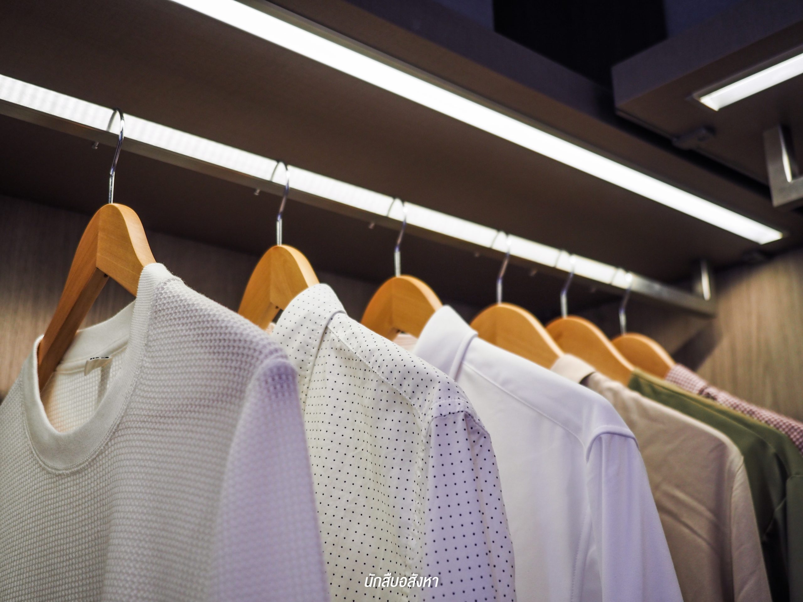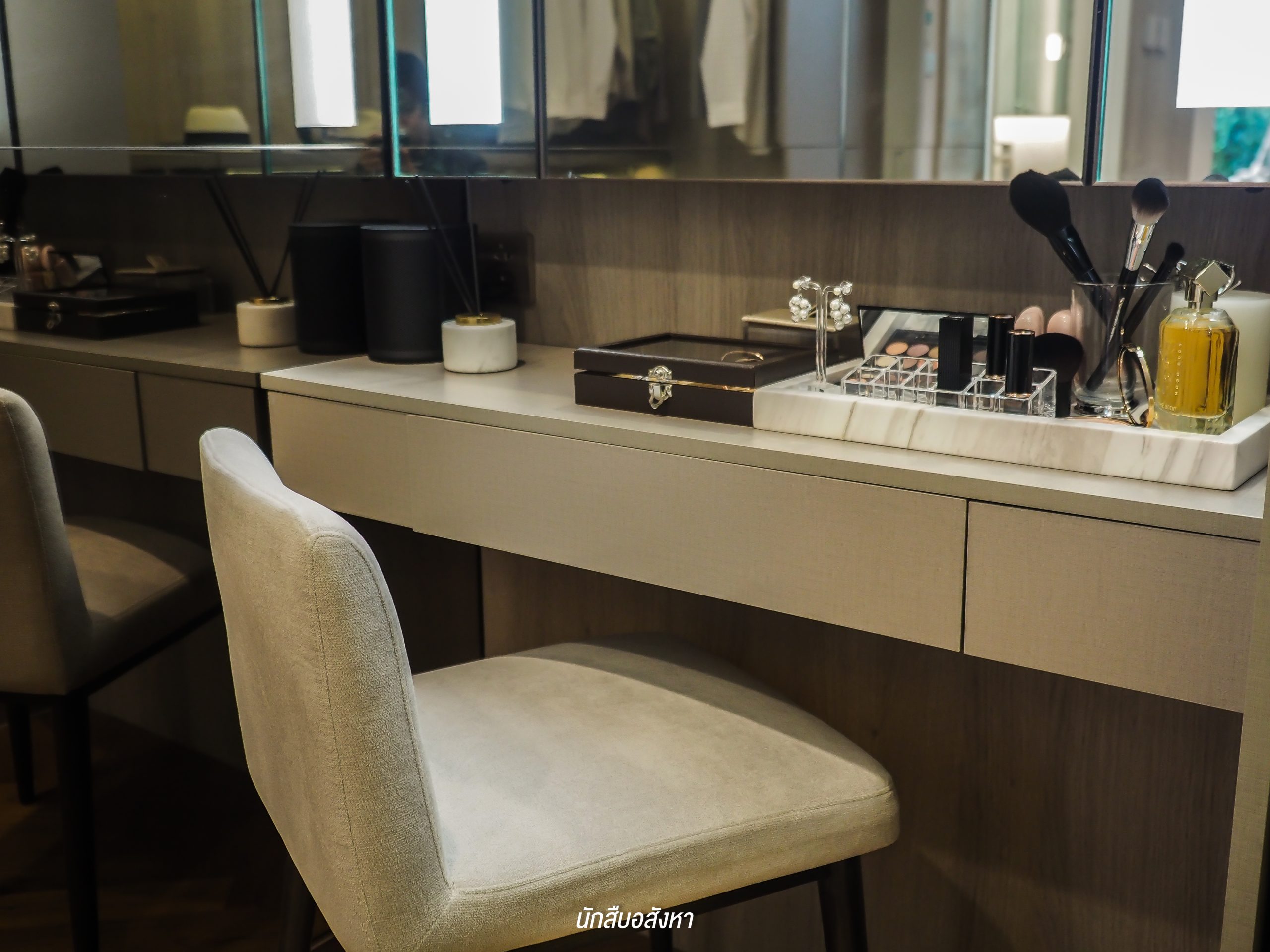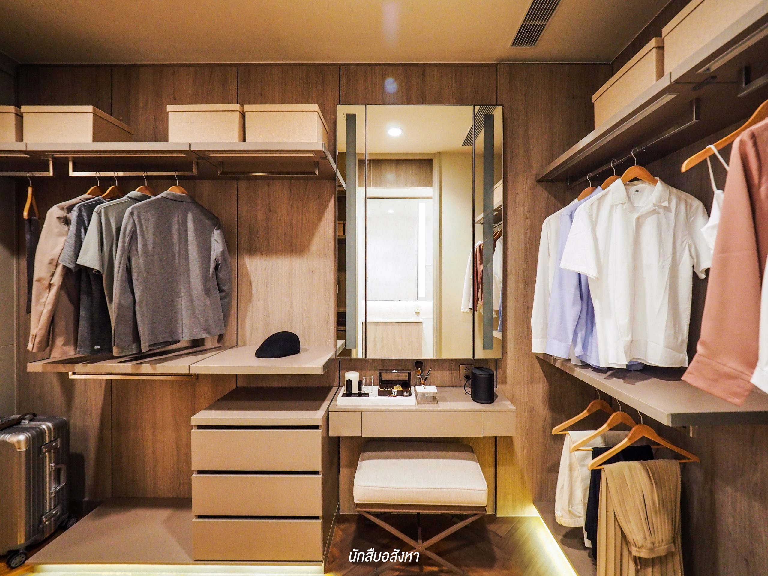 ห้องนี้มี Walk-in Closet ขนาดใหญ่ด้วยครับ ซึ่งตู้ที่เห็นในรูปก็คือทางโครงการ Built-in ให้แบบนี้เลย แต่ส่วนของกระจกหน้าโต๊ะเครื่องแป้งนั้นไม่ได้ให้มาด้วย และยังมีระบบเซ็นเซอร์สำหรับเปิดไฟตอนกลางคืนให้มาด้วยครับ
