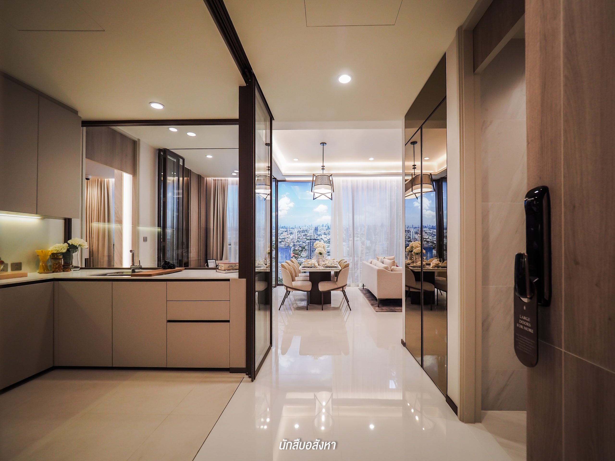 มาต่อกันที่ห้อง 2 Bedroom ขนาด 114 ตร.ม. กันครับ สำหรับประตูห้องนี้จะเป็น Digital Door Lock เช่นกัน แต่สิ่งที่พิเศษกว่าห้อง 1 Bedroom ก็คือบานประตูบานคู่ ให้ความกว้างมากกว่าเพื่อรองรับผู้สูงอายุที่ต้องนั่ง Wheelchair และมีตู้เก็บของอเนกประสงค์บริเวณหน้าห้องสำหรับเก็บของใช้จุกจิกต่างๆ ส่วนพื้นที่ของห้องครัวนั้นกว้างมากครับ เป็นฟังก์ชันครัวปิด ประตูบานเลื่อนแบบพับเก็บได้และตกแต่งแบบ L – Shaped Kitchen ตัวอุปกรณ์จะได้ตามรูปเลยครับ มีทั้งเครื่องดูดควันและตู้เย็นอีก 2 หลัง Built-in ให้เรียบร้อย ส่วนมุม Laundry จะไม่ได้อยู่ในห้องครัวเหมือนกับห้อง 1 Bedroom แต่จะย้ายมาอยู่บริเวณหน้าห้องครัวติดกับห้องน้ำด้านนอกครับ ซึ่งขนาดก็จะกว้างมากขึ้น วางเครื่องซักผ้าได้ 2 เครื่อง และมีพื้นที่สำหรับเก็บของใช้ได้อีกครับ สำหรับ Floor to Ceiling ส่วนนี้จะอยู่ที่ 2.70 เมตรครับ