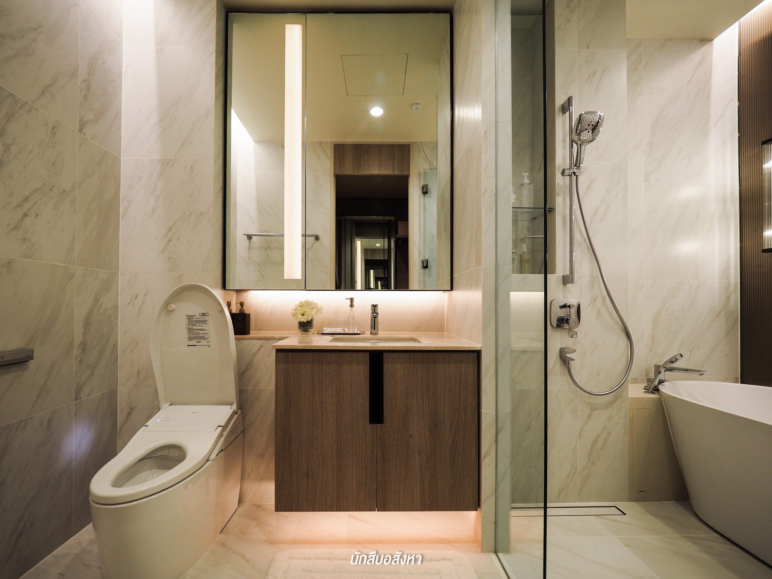 สำหรับตัวห้องน้ำจะเชื่อมต่อกับ Walk-in Closet ซึ่งแปลนรูปแบบนี้ผมว่าค่อนข้างเอื้อความสะดวกให้ผู้อยู่อาศัยค่อนข้างมากทีเดียวครับ ห้องน้ำแยกโซนแห้งโซนเปียกเป็นสัดส่วน พื้นที่อาบน้ำค่อนข้างกว้างมาก มี Bathtub แบบส่วนตัว มี Rain Shower ส่วนตัวสุขภัณฑ์นั้นจะเป็นแบรนด์มาตรฐานระบบ Auto และตัวกระจกบริเวณซิงค์ล้างหน้าทางโครงการติดตั้งให้แบบนี้เลยครับ ด้านหลังกระจกนั้นสามารถใช้เก็บของใช้ได้