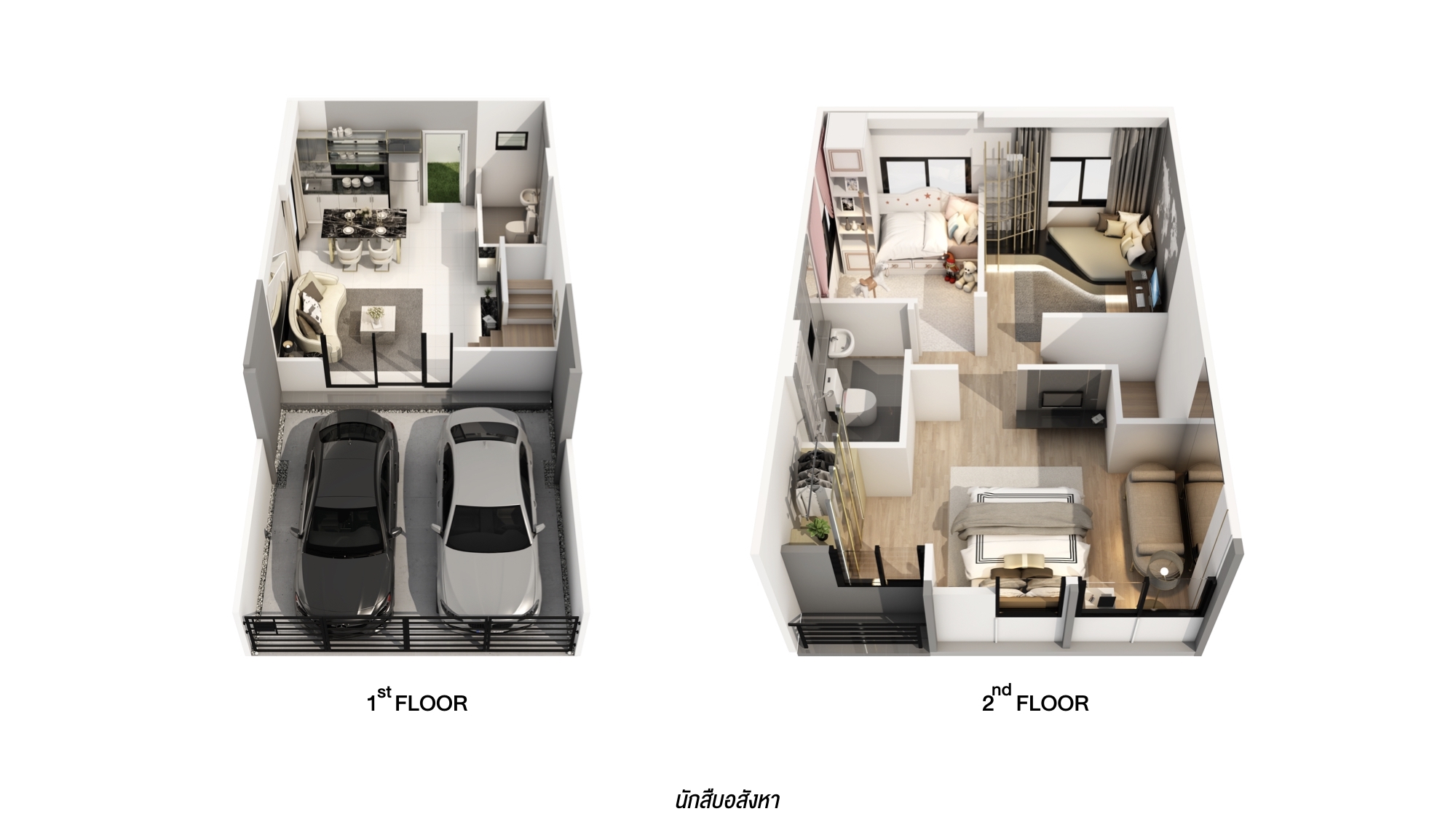 ชั้น 1 : ด้านหน้าทางเข้าจะเป็นพื้นที่จอดรถ สามารถจอดได้ 2 คัน เดินเข้ามาภายในบ้านจะเจอพื้นที่นั่งเล่น และเข้าไปจะเจอครัว พร้อมพื้นที่นั่งทานข้าว ด้านหลังบ้านมีพื้นที่ที่สามารถจัดสวนเล็กๆ ได้ และมี 1 ห้องน้ำ