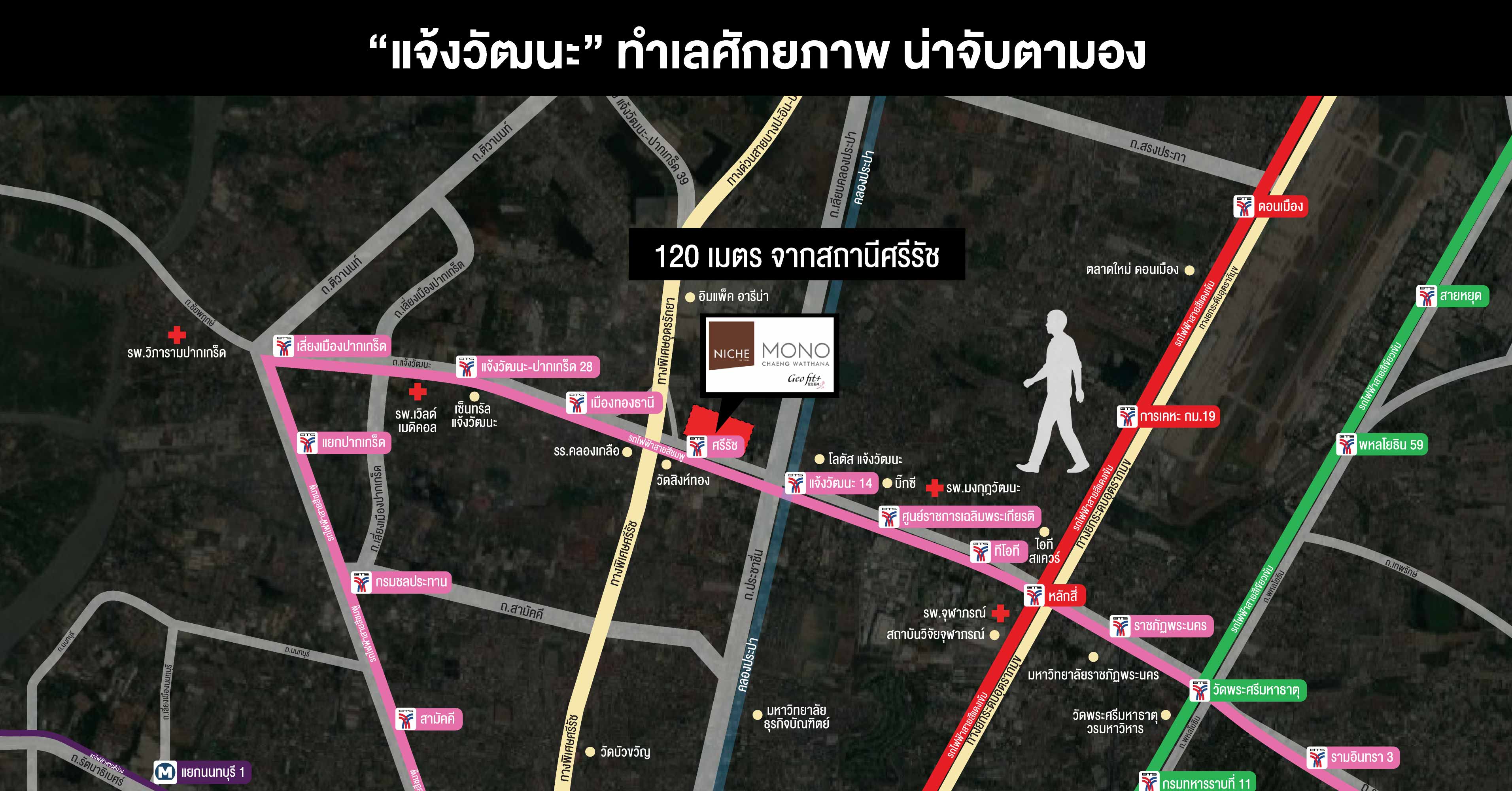 โครงการ “Niche MONO แจ้งวัฒนะ” เป็นโครงการใหม่ ใกล้รถไฟฟ้าสายสีชมพู (MRT) สถานีศรีรัช ในระยะเดินไม่เหนื่อย เพียง 120 เมตร และตัวโครงการอยู่ติดถนนแจ้งวัฒนะ มาพร้อม Concept น่าสนใจอย่าง “Recharge Your Digital Life” หรือการรีชาร์จชีวิตคนเมืองในยุคดิจิตอลนั่นเอง เน้นการพักผ่อนและเพิ่มความปลอดภัยต่างๆ ให้กับการพักอาศัยในแบบของคนยุคดิจิตอล เพื่อลูกบ้านจริงๆ