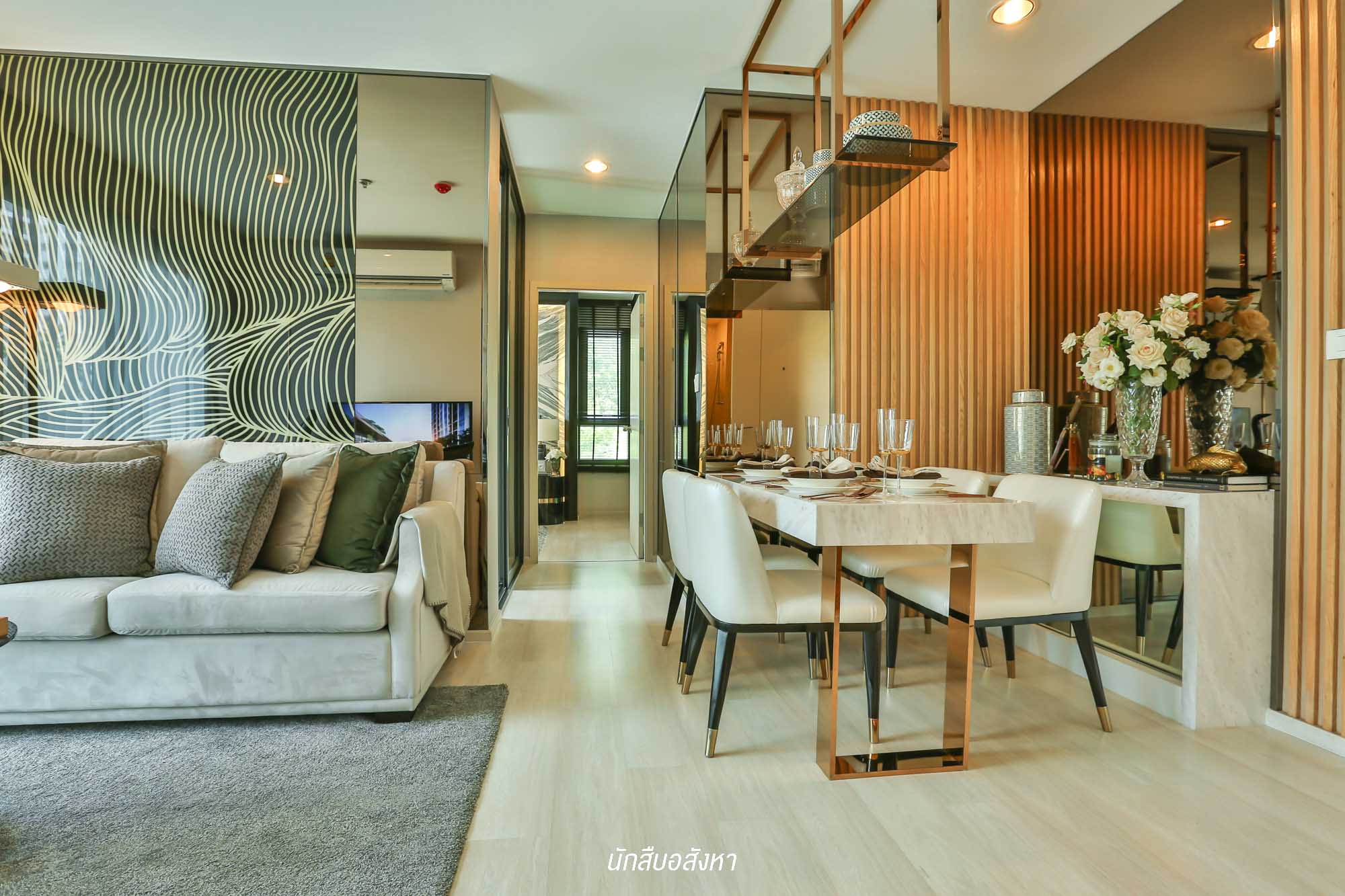 ห้องแบบ 1 Bed ที่นี่แบ่งโซนนั่งเล่นค่อนข้างหน้ากว้าง วางโซฟาและโต๊ะเล็กพร้อมโคมไฟข้างๆได้ ส่วนพื้นที่ตรงกลาง ยังวางพรมผืนใหญ่กับโต๊ะกลางได้ แบบเดินแล้วไม่เกะกะ ด้านข้างมีการแบ่งโซนครัวและโต๊ะทานข้าวให้แล้ว