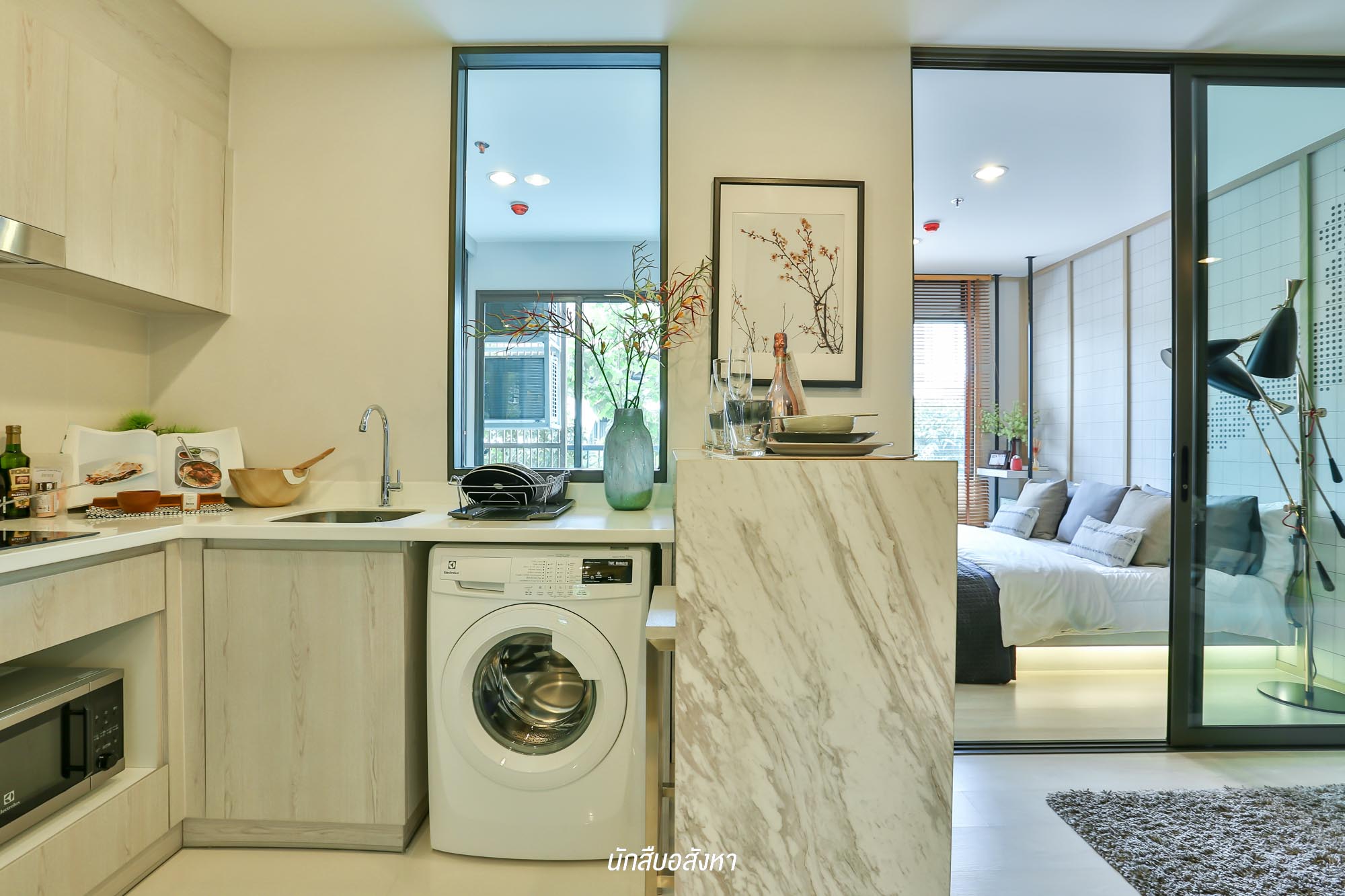 ซึ่งดูจาก Layout ผมว่าห้องนี้สามารถใช้ชีวิตได้จริง อยู่อาศัยได้อย่างไม่อึดอัด เพราะในส่วนของ Living มีพื้นที่กว้างขวางมากพอที่จะวางโซฟา และโต๊ะกลางได้อย่างพอดี อีกทั้งครัวเป็นแบบระบบปิด มีฉากกั้นบานเลื่อนแยกพื้นที่เป็นสัดส่วน เพื่อไม่ให้ส่งกลิ่นรบกวนไปทั่วห้องขณะทำอาหาร และในส่วนของห้องนอน โครงการใช้เป็นประตูบานเปิดแบบทึบ ทำให้ดูเป็นพื้นที่ส่วนตัวเสมือนอาศัยอยู่บ้าน เรามาดูห้องถัดไปกันต่อครับ