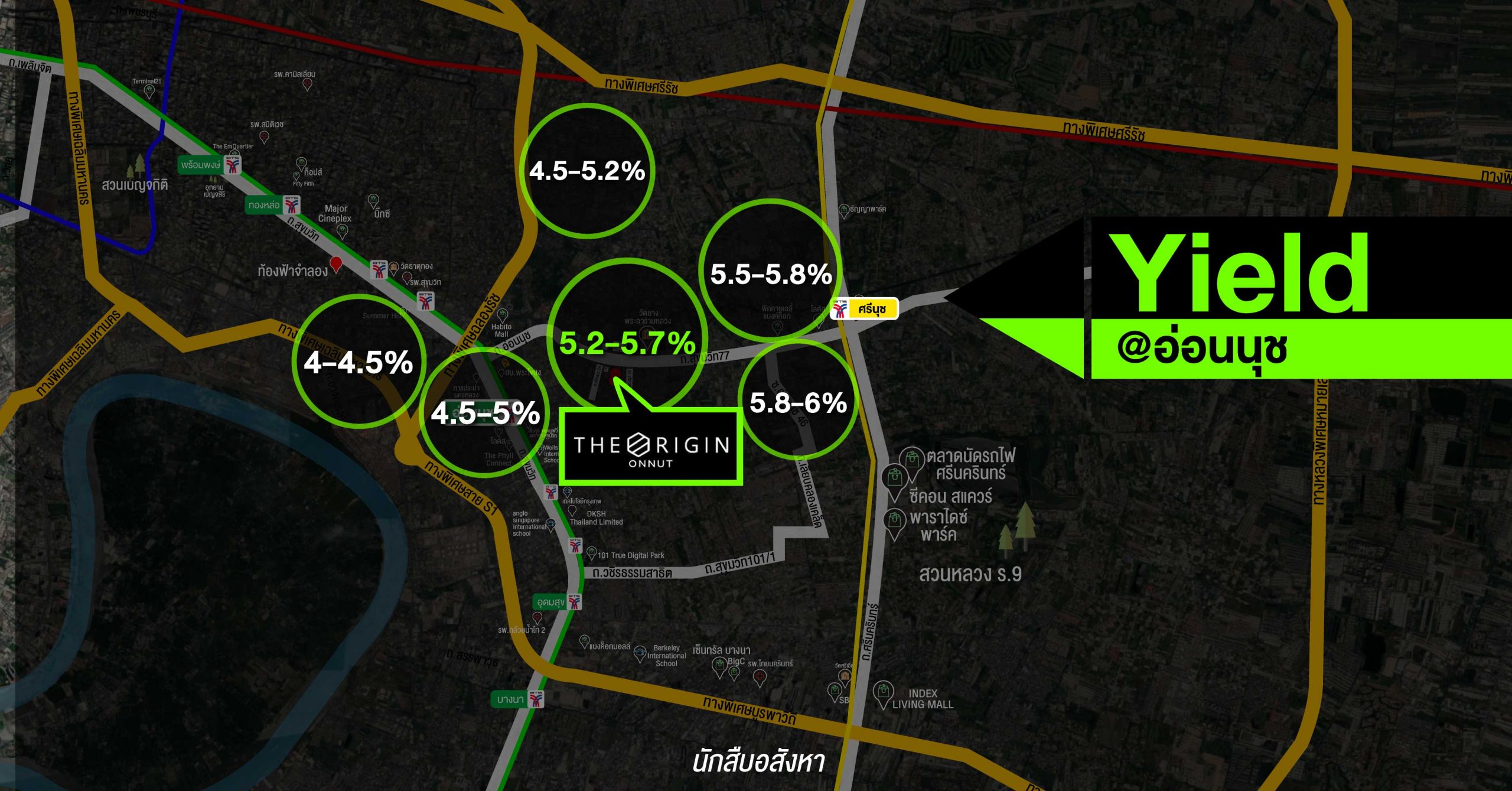 เริ่มจากตัวเลขแรกอย่าง Yield ในทำเลอ่อนนุชกันก่อนเลยครับ ซึ่งข้อมูลจาก Hipflat ล่าสุดนั้นจะเห็นได้เลยครับ Yield ของทำเลอ่อนนุชตอนนี้เป็นตัวเลขที่ถือว่าสูงเลยทีเดียวครับ เฉลี่ยอยู่ที่ประมาณ 4 – 6% ซึ่งเริ่มตั้งแต่ปากซอยอ่อนนุช กลางซอย ไปจนถึงท้ายซอย ทุกพื้นที่เป็นทำเลที่ไม่ได้ด้อยไปกว่ากันเลยครับ ซึ่งโครงการ “The Origin Onnut” นั้นจะอยู่บริเวณซอยอ่อนนุช 24 ครับ