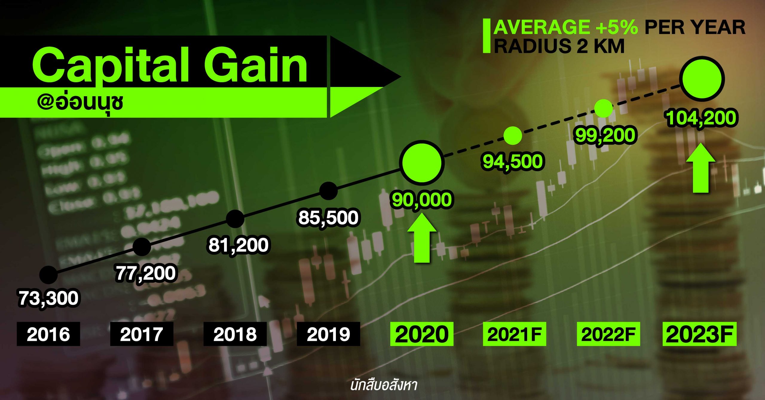 นอกจากนี้แล้วอีกตัวเลขที่น่าสนใจมากก็คือ Capital Gain สำหรับคอนโดฯ รูปแบบ Low Rise ของทำเลอ่อนนุช ซึ่งตัวเลขโตเฉลี่ยอยู่ที่ 5% ต่อปี จากกราฟจะเห็นได้เลยครับว่าตัวเลขตั้งแต่ปี 2016 จนถึงปี 2020 เพิ่มขึ้นทุกปี และยังมีแนวโน้มเพิ่มขึ้นอย่างต่อเนื่องในปี 2023 แตะเข้าหลักแสน ชี้ให้เห็นว่าการลงทุนในย่านนี้ค่อนข้างน่าสนใจมากเลยทีเดียวครับ สำหรับโครงการ “The Origin Onnut” คาดว่าจะสร้างเสร็จช่วง Q4 ปี 2022 ซึ่ง Capital Gain ในปีนี้จะตกอยู่ที่ประมาณ 99,200 บาท* แล้วครับ