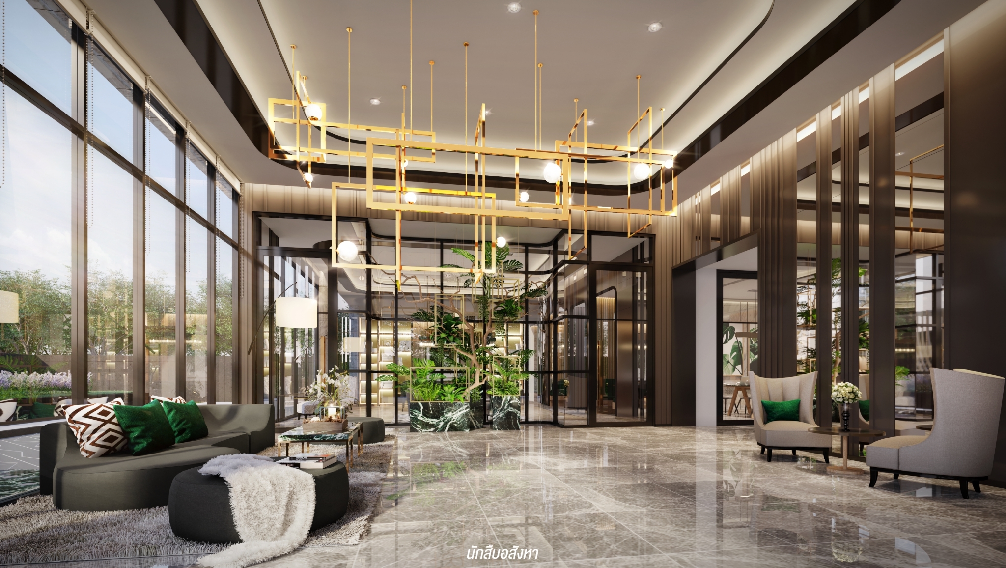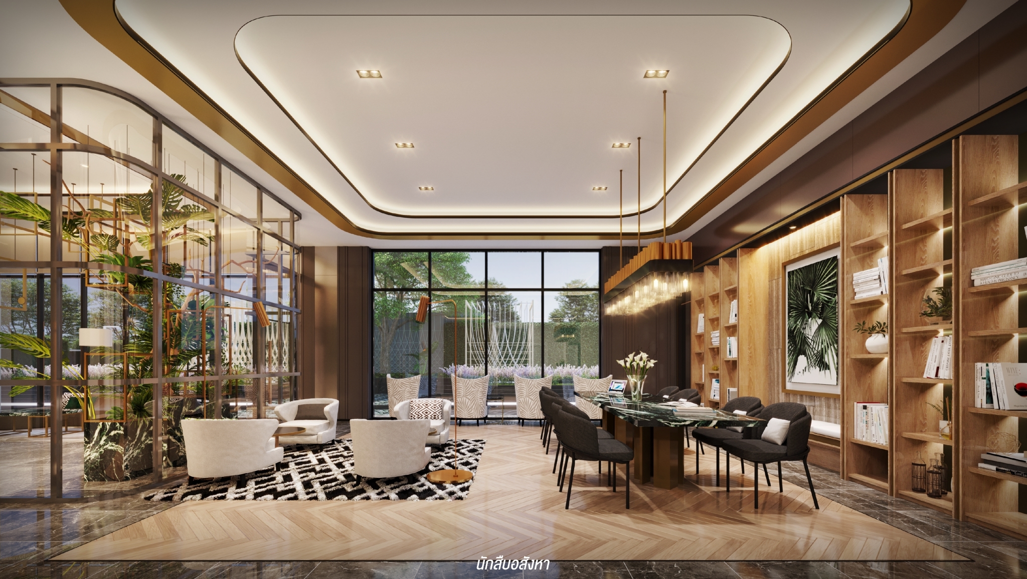 เข้ามาชมส่วนกลางของชั้น 1 จะมี Lobby อยู่ 2 โซน สำหรับลูกบ้านและ Guest (Lobby Lounge) บรรยากาศภายในเป็นแนว Tropical มีความเป็นธรรมชาติและมีสีทองที่เพิ่มความ Luxury มี Shop 1 ยูนิต และะมี Co-Working Space และ Meeting Room ห้องประชุมที่ใช้ Application เชื่อมต่อการใช้งาน