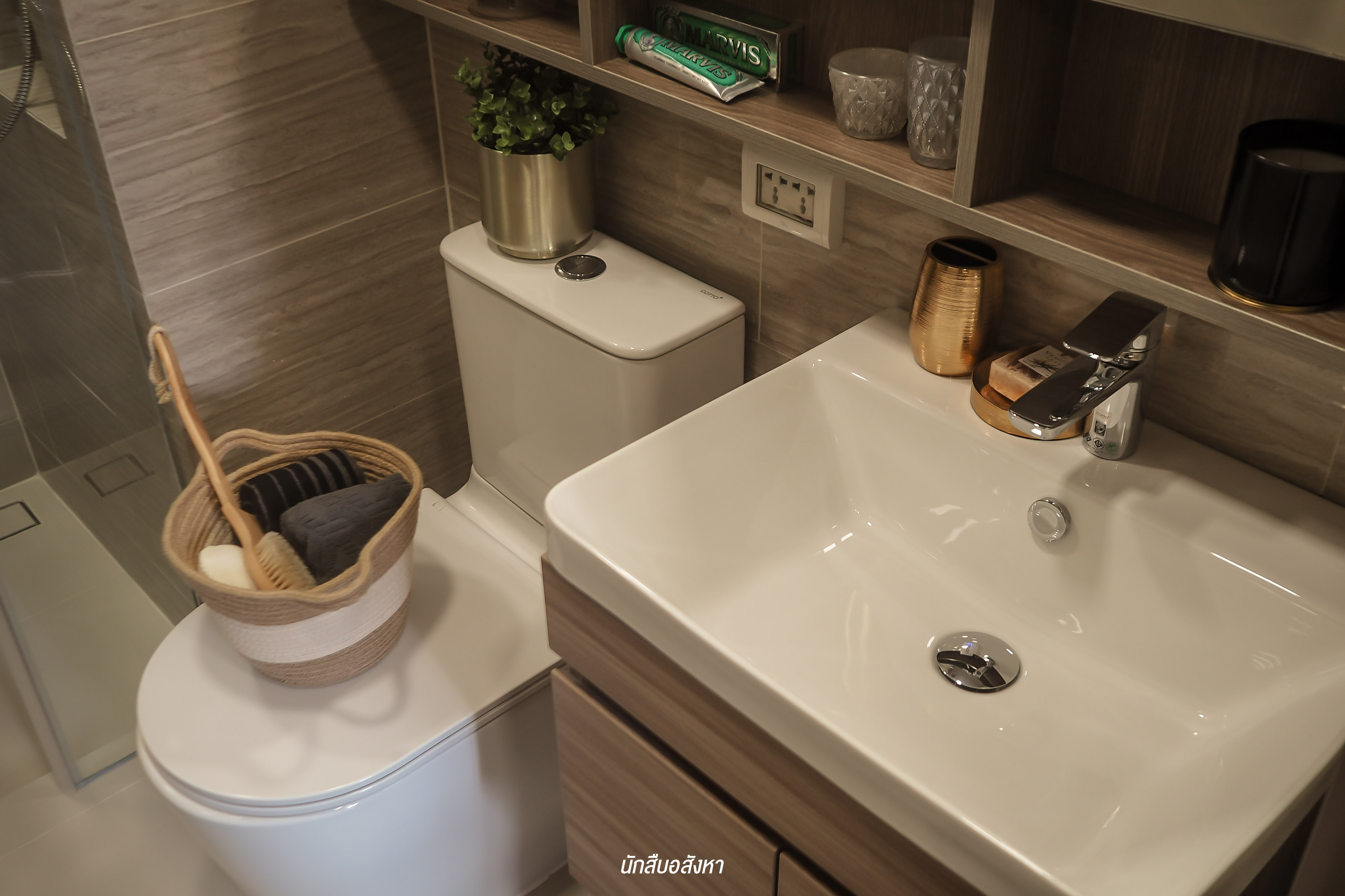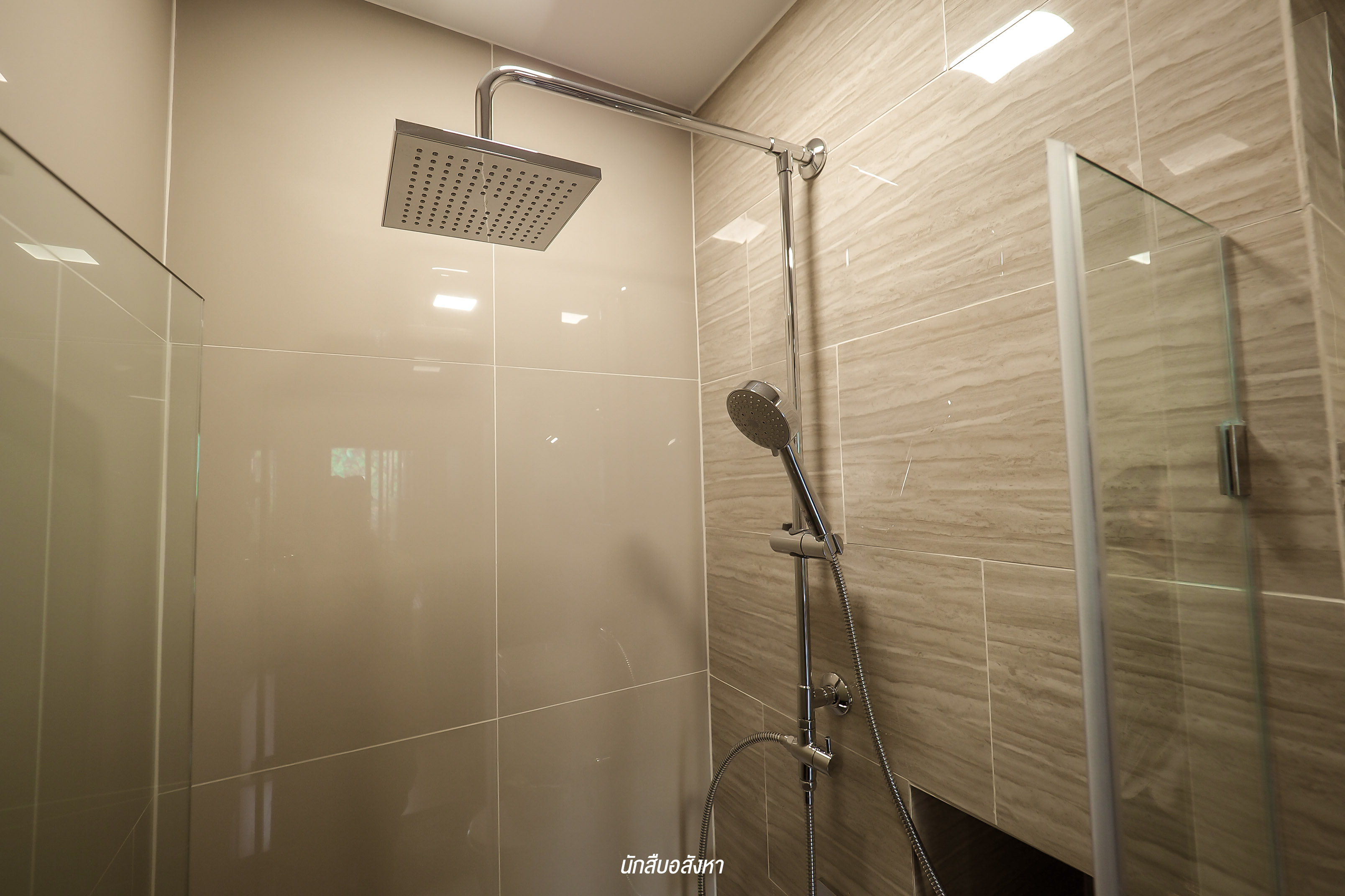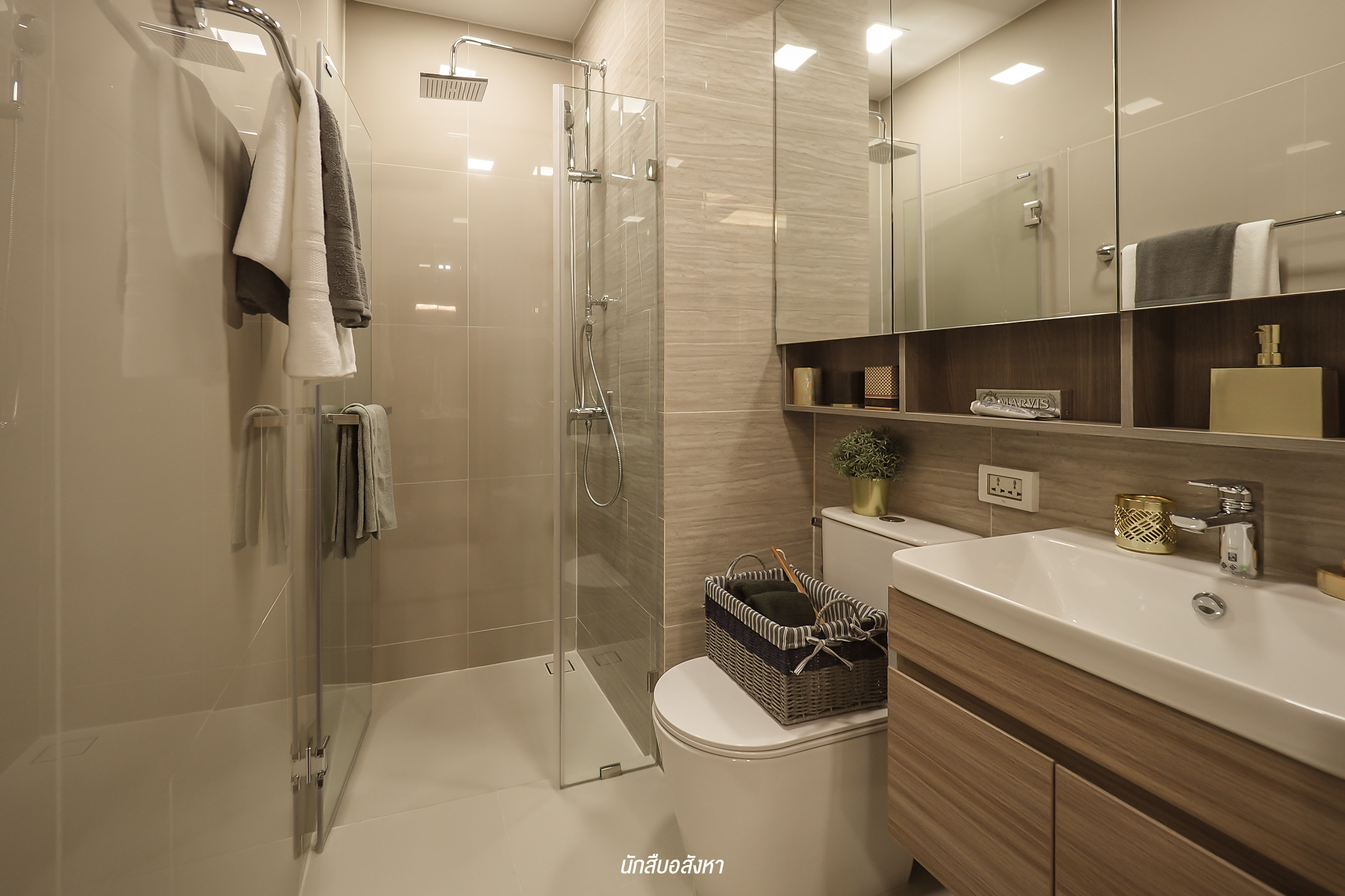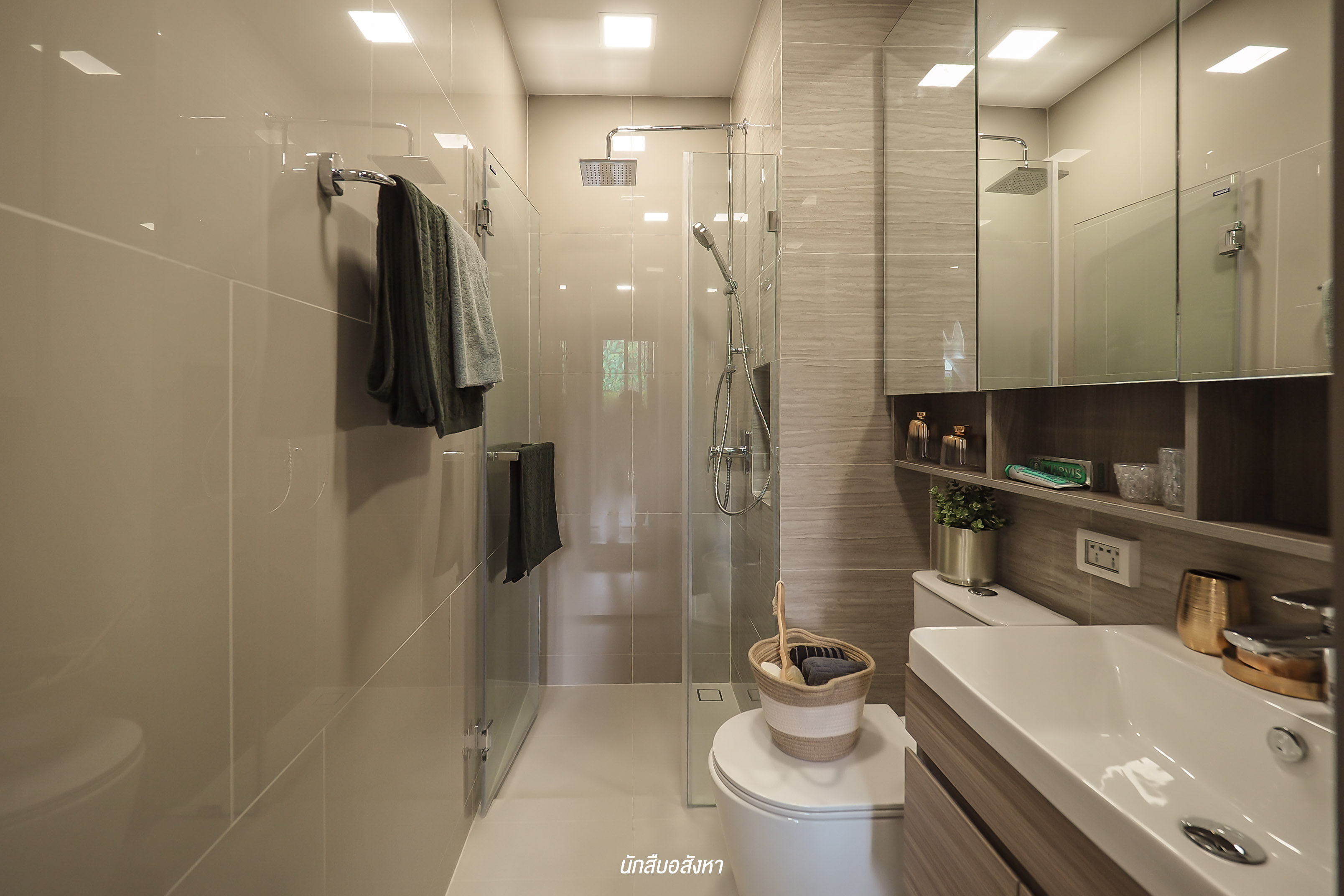 ที่นี่จะให้แบบ Fully Fitted นะครับ โดยให้ Wall Paper (สีเทา) ครัวและส่วนที่ Built-in ชั้นวางของ โครงการยังให้ Backslash เป็นกระเบื้องเซรามิคสีรีม ขนาด 60X60 เพื่อป้องกันคราบสกปรก ทำความสะอาดง่าย รวมถึงเตาไฟฟ้าและเครื่องดูดควันของ Franke และแถมที่พักจานด้วย ส่วนระบบท่อดูดควันเป็นการทิ้งไปข้างนอก ซึ่งมีข้อดีคือไม่เป็นมลพิษภายในโครงการครับ ส่วนตัวผมชอบห้องน้ำของที่นี่นะครับ เพราะได้ Full Option หลายอย่าง มีช่องใส่ของด้านหลังกระจก Rain shower ใหญ่ ปรับระดับน้ำได้ 5 ระดับ และผนังยังเป็นพาสวูดกันน้ำ 100% ด้วยครับ สุดท้ายโครงการมีแถมตู้เสื้อผ้า Built-in ให้ด้วยนะครับ