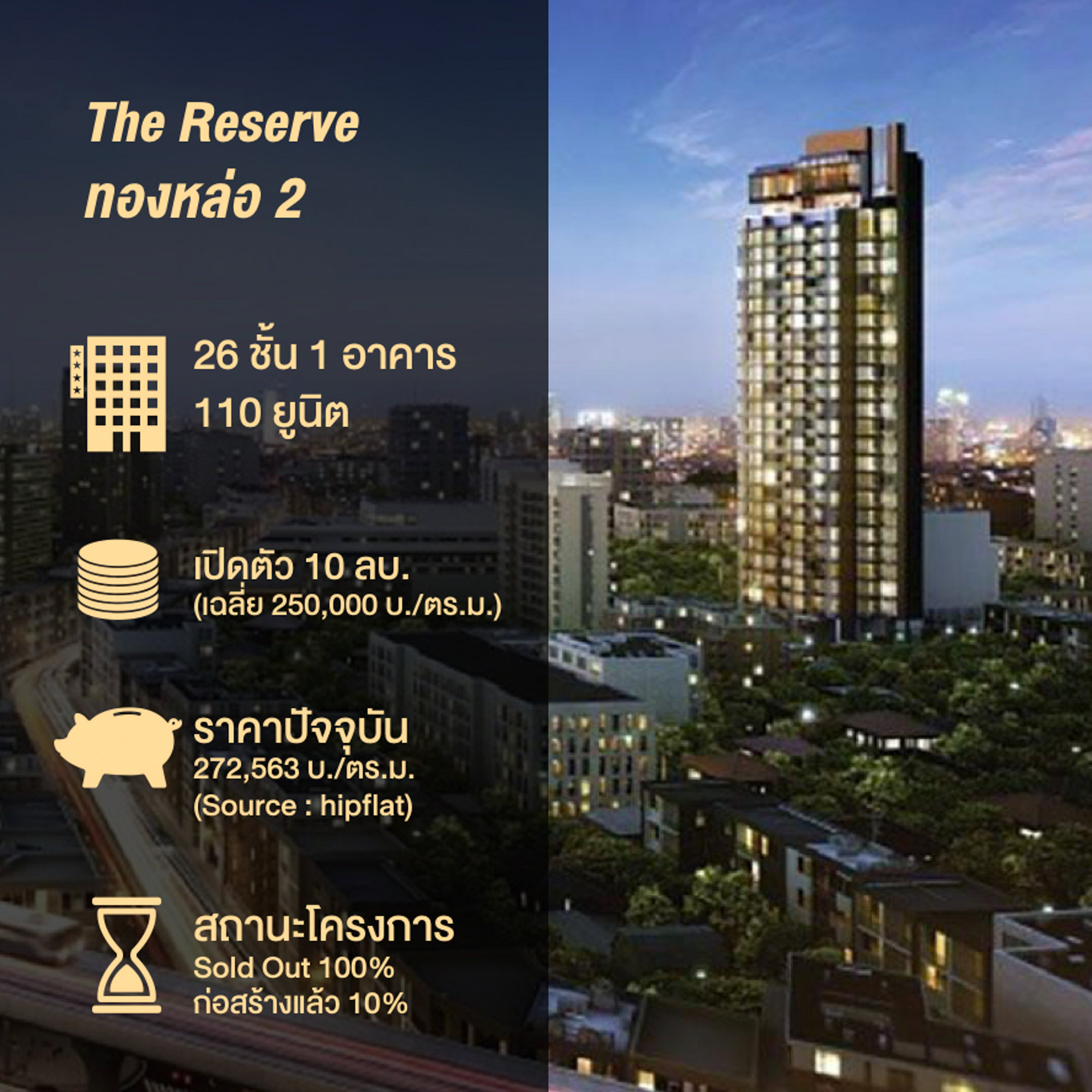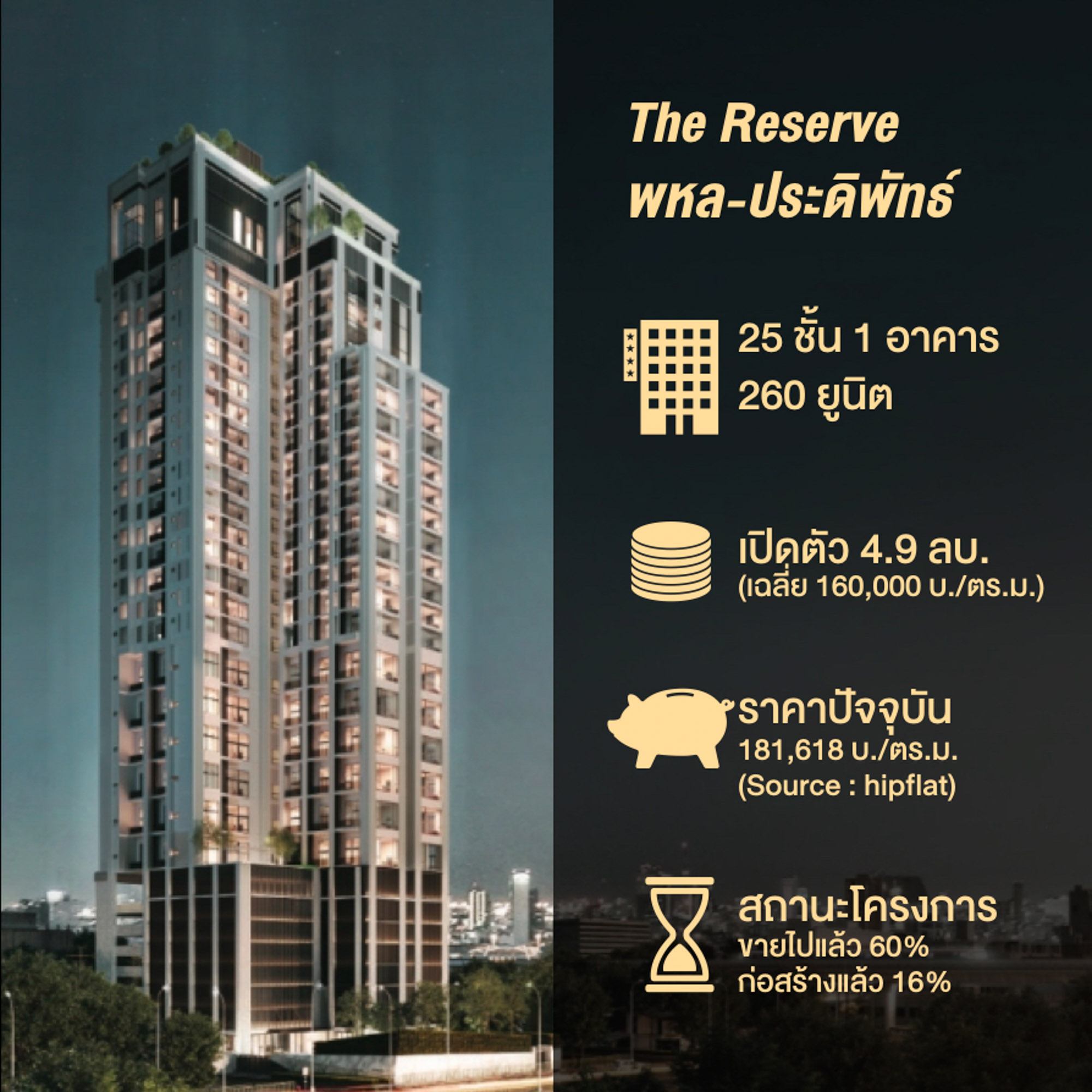 หลังประสบความสำเร็จ Sold Out โครงการ The Reserve ทองหล่อ 2 ทางโครงการก็ทำคอนโดสไตล์ Loft เพดานสูง 4.4 m. อย่าง The Reserve พหล-ประดิพัทธ์ คอนโด ใกล้ BTS สะพานควาย (ปากซ.ประดิพัทธ์ 23) อาคารสูง 25 ชั้น แต่ที่จอดรถไม่ 100% มีเพียง 60% แต่ราคาแพง บนทำเลที่ Demand ไม่ค่อยมีสตางค์ ถึงมีก็ไม่ซื้อ จึงทำให้โครงการนี้ก็แป๊กไปตามระเบียบ ตอนนี้ก็ยังมีเหลือขายอยู่ครับ ราคา 1 Bed 6.5 ล้าน ใครสนใจจองได้ครับ
