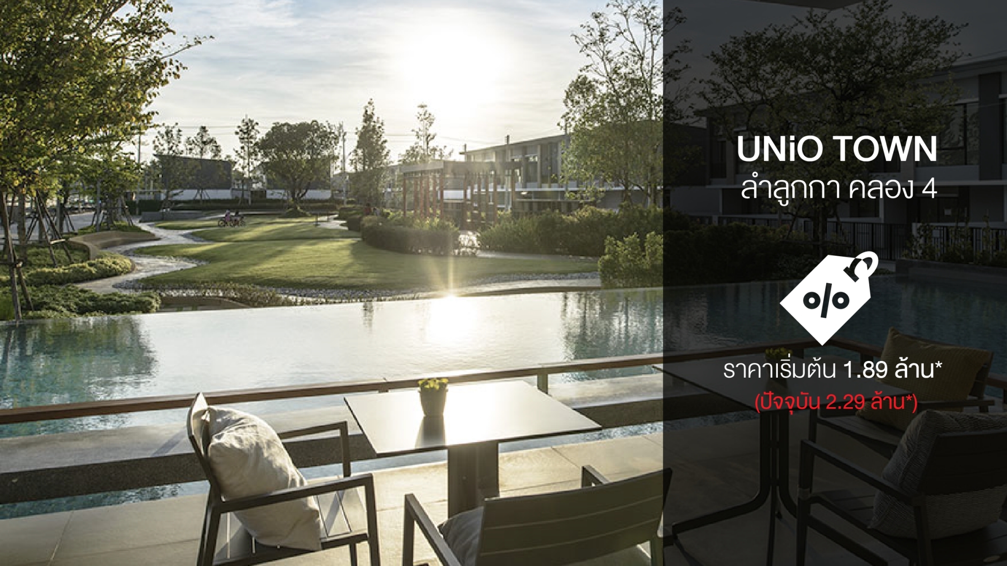 เริ่มกันที่โครงการที่เปิดตัวเป็นโครงการแรกที่ลำลูกกา คลอง 4 อย่าง “UNiO TOWN ลำลูกกา คลอง 4” ในราคาเริ่มต้น 1.89 ล้าน* (ปัจจุบัน 2.29 ล้าน*)